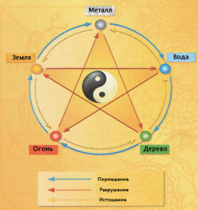 Чаще всего «у-син» переводится как «пять элементов, пять начал, пять стихий». Каждому из четырех состояний природы был дан символ: дерево, огонь, металл. вода. а пятый символ -земля добавлен , т.к. все изменения происходят на Земле. Дерево — символ рождения и роста, Огонь - максимальной активности, Металл - начинающегося упадка, Вода - минимальной активности, Земля — центр и ось циклических изменений. Элементы зависимы и связаны друг с другом. Китайский врачеватель знает в какое время года лучше заниматься лечением и профилактикой того или иного заболевания, какими вкусовыми ощущениями следует руководствоваться при определении диеты, какого эмоционального состояния следует избегать и т. д. Пять стихий имеют инь и ян свойства. При лечении в традиционной китайской медицине сначала строят цепочку взаимосвязей по принципу у-син, находят в ней дисбаланс инь и ян ,затем только непосредственно воздействуют на болезнетворное начало, поврежденные органы и функциональные системы. Китайская медицина рассматривает организм человека как единое целое и как часть одного мироздания, которое находится с ним в тесных взаимоотношениях.